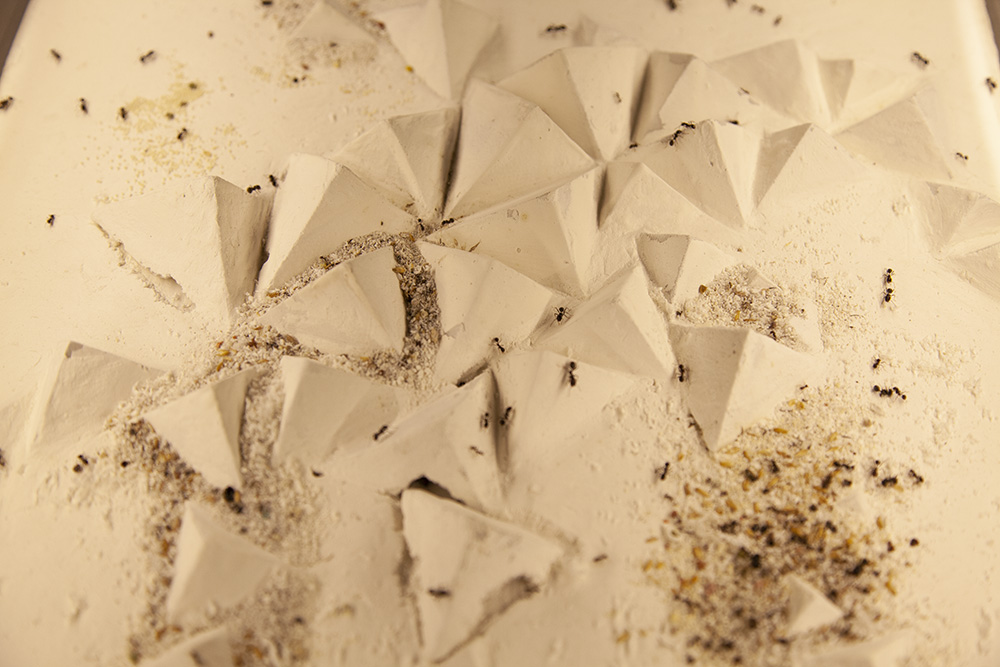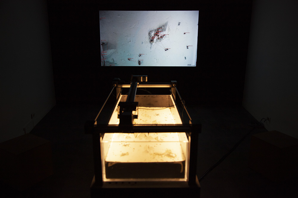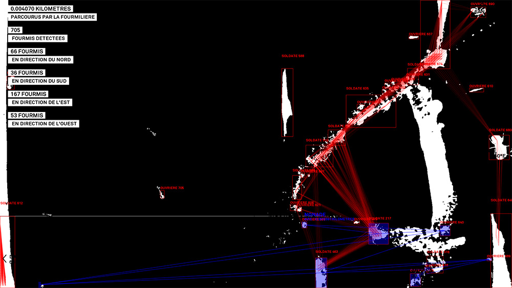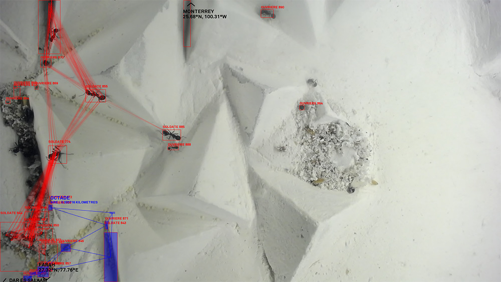 A camera, autonomously piloted by a two- axis system, observes an anthill and its population. The machine vision system attempts to find suspicious ants’ movements and patterns which will then, dictate how and where the camera has to move.